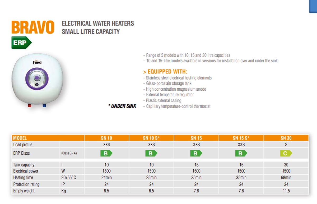 Model: Bravo Tara de origine: ItaliaBoilerul electric Ferroli Bravo este fabricat cu un înveliș deosebit de rezistent din polipropilenă tratat cu un strat anticoroziv prin vitropotelanare cu pulberi „Blue Silicon” (patent Ferroli) impotriva depunerilor de calcar si a microelementelor ce apar in procesul fierberii, ceea ce ofera o durata de viata lunga. Dotat cu termostat pentru relgarea ușoară a temperaturii apei.