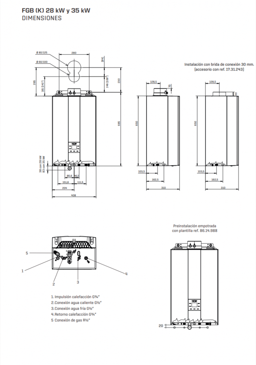 Garantie: 24 luni Model: 28 KWCentrala are o carcasă elegantă și compactă care oferă multiple posibilități de montare. Pentru componentele interne au fost alese materiale robuste și durabile cum ar fi țevi din cupru, schimbător de căldură turnat din aluminiu, fibră de sticla armată, bloc hidraulic din poliamidă si schimbător de căldură pentru a.c.m. din inox ( la varianta combi). Schimbătorul de căldură este proiectat cu spații mari si simple de trecere pentru agentul termic. Pompa de înaltă eficiență împreună cu ventilatorul și cu schimbătorul de căldură caracterizat printr-o conductivitate termica ridicată, conferă într-un mod foarte simplu centralei tip FGB, clasa de eficiență energetică A conform directivei ErP. Alte componente auxiliare cum ar fi: supapa de siguranță, tava de condens, vasul de expansiune, ventilul de aerisire și clapeta antiretur a gazelor de ardere (pentru sistemul multiplu de conectare la coșul de fum), sunt integrate din fabrică. Instalarea și întreținerea pot fi făcute foarte repede de către o singură persoană datorită sistemului de fixare si conectare hidraulica proiectat.