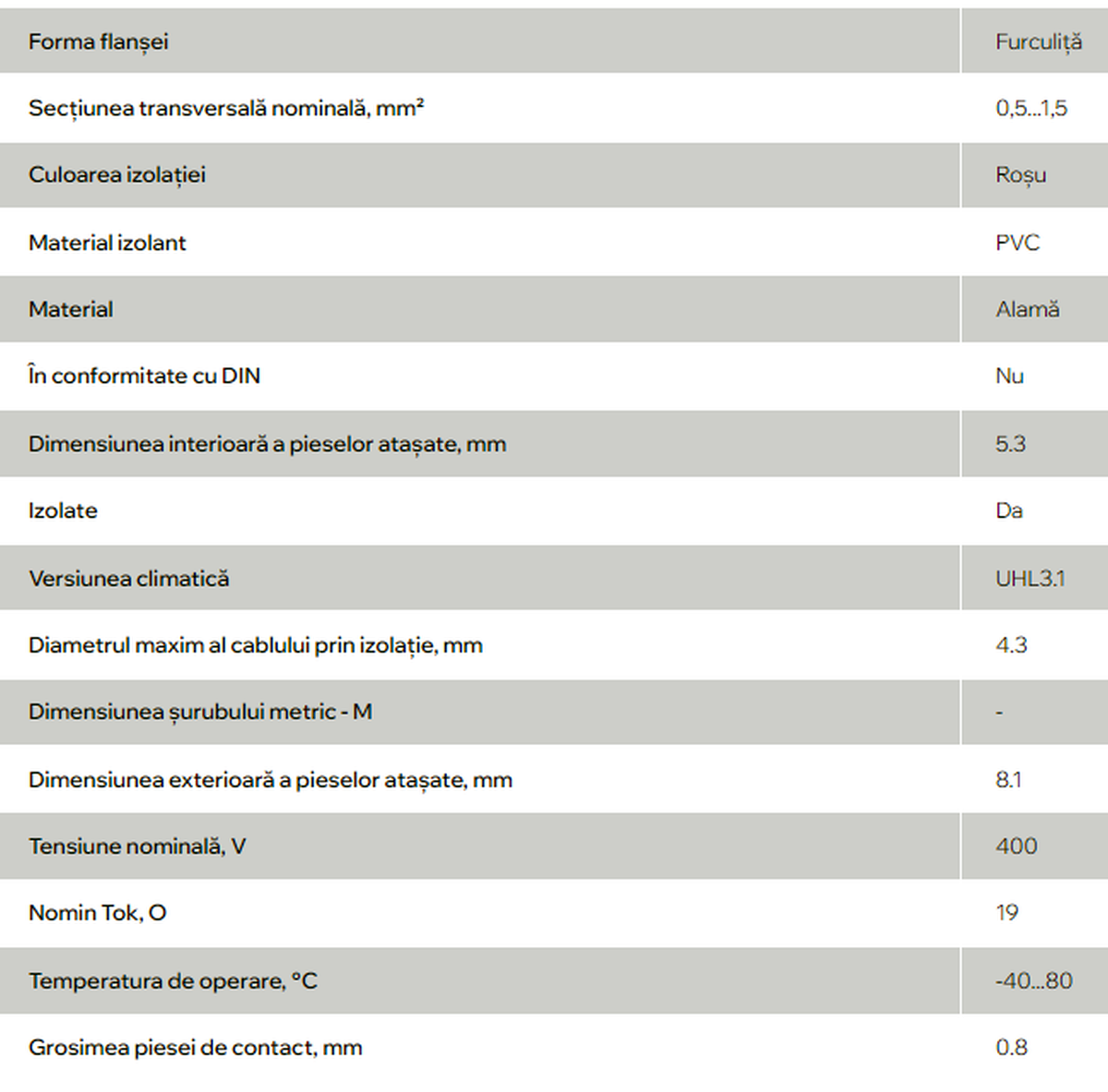 Vârful furcii este proiectat pentru sertizarea firelor cu conductoare de cupru și este utilizat pentru instalarea unităților electrice, unde este prevăzută o conexiune de contact adecvată bazată pe fixarea șurubului. Este posibilă demontarea completă a conexiunii de fixare numai prin slăbirea fixării șurubului. Materialul piesei de contact: cupru M1. Acoperirea părții de contact: cositorire electrolitică (asigură protecția produsului împotriva coroziunii). Introducerea ușoară a firului în interiorul manșonului de cupru