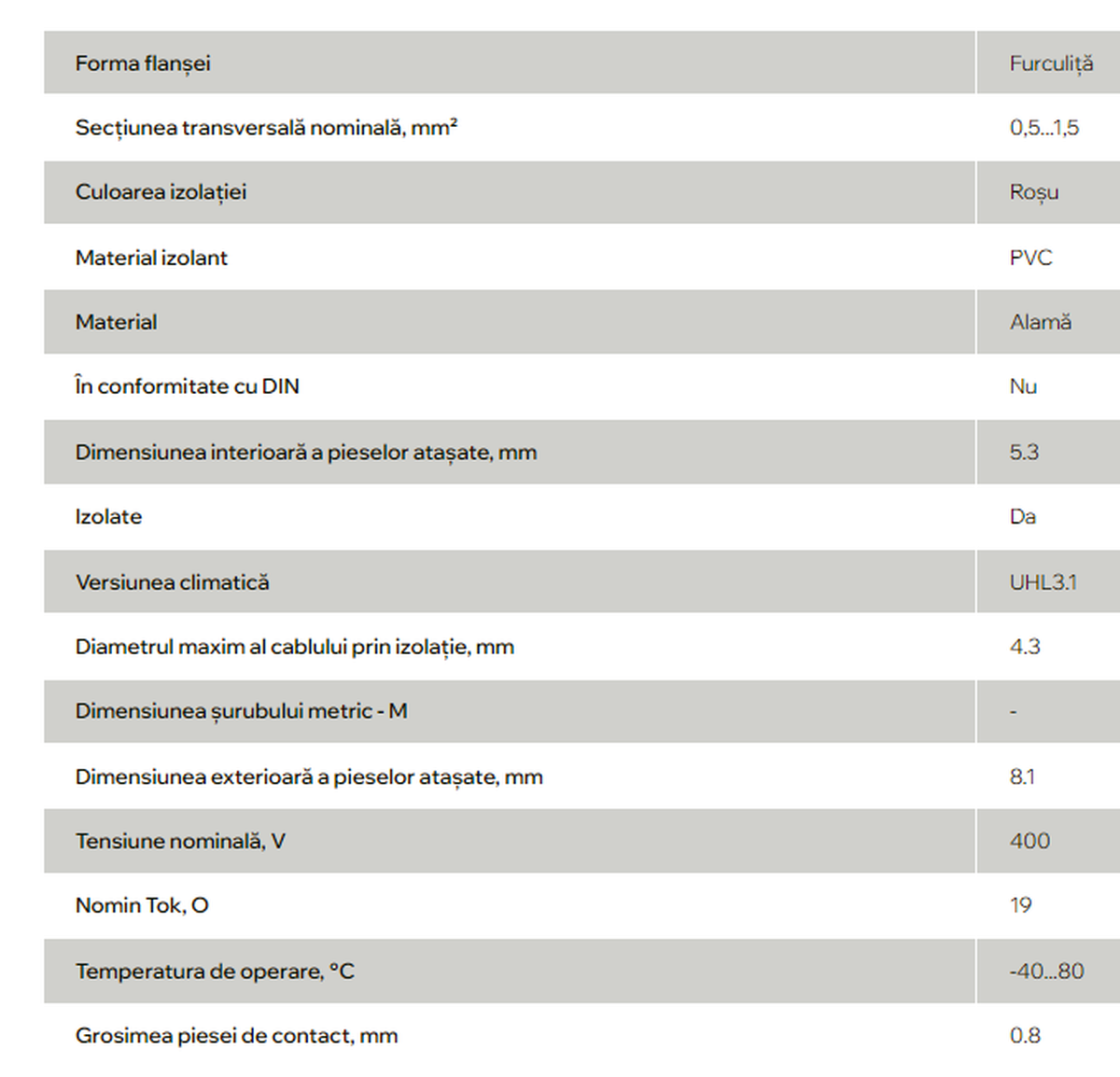 Vârful furcii este proiectat pentru sertizarea firelor cu conductoare de cupru și este utilizat pentru instalarea unităților electrice, unde este prevăzută o conexiune de contact adecvată bazată pe fixarea șurubului. Este posibilă demontarea completă a conexiunii de fixare numai prin slăbirea fixării șurubului. Materialul piesei de contact: cupru M1. Acoperirea părții de contact: cositorire electrolitică (asigură protecția produsului împotriva coroziunii). Introducerea ușoară a firului în interiorul manșonului de cupru