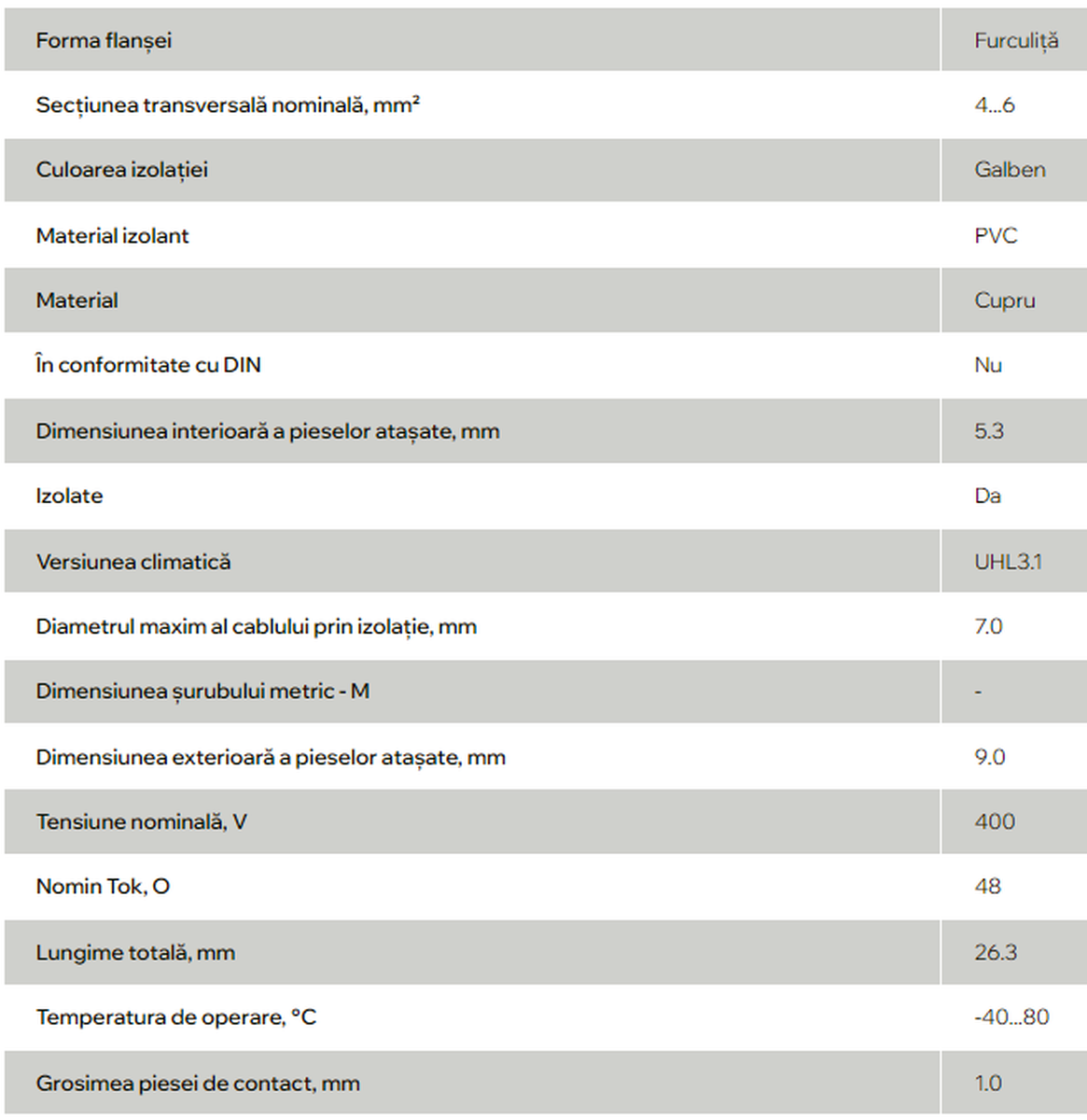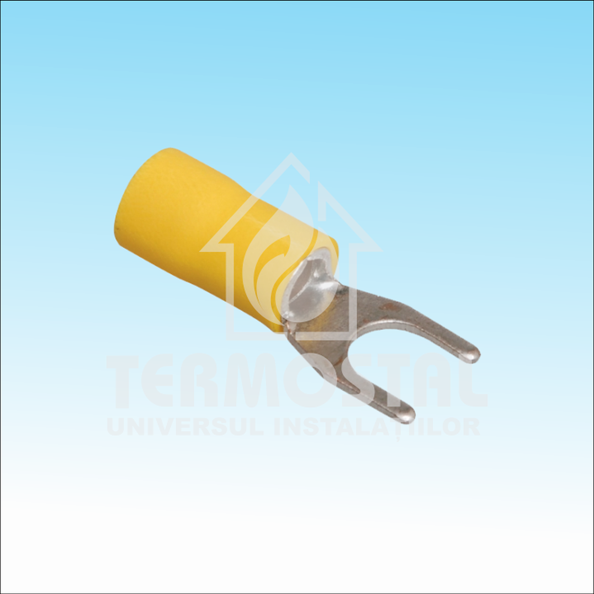 Vârful furcii este proiectat pentru sertizarea firelor cu conductoare de cupru și este utilizat pentru instalarea unităților electrice, unde este prevăzută o conexiune de contact adecvată bazată pe fixarea șurubului. Este posibilă demontarea completă a conexiunii de fixare numai prin slăbirea fixării șurubului. Materialul piesei de contact: cupru M1. Acoperirea părții de contact: cositorire electrolitică (asigură protecția produsului împotriva coroziunii). Introducerea ușoară a firului în interiorul manșonului de cupru