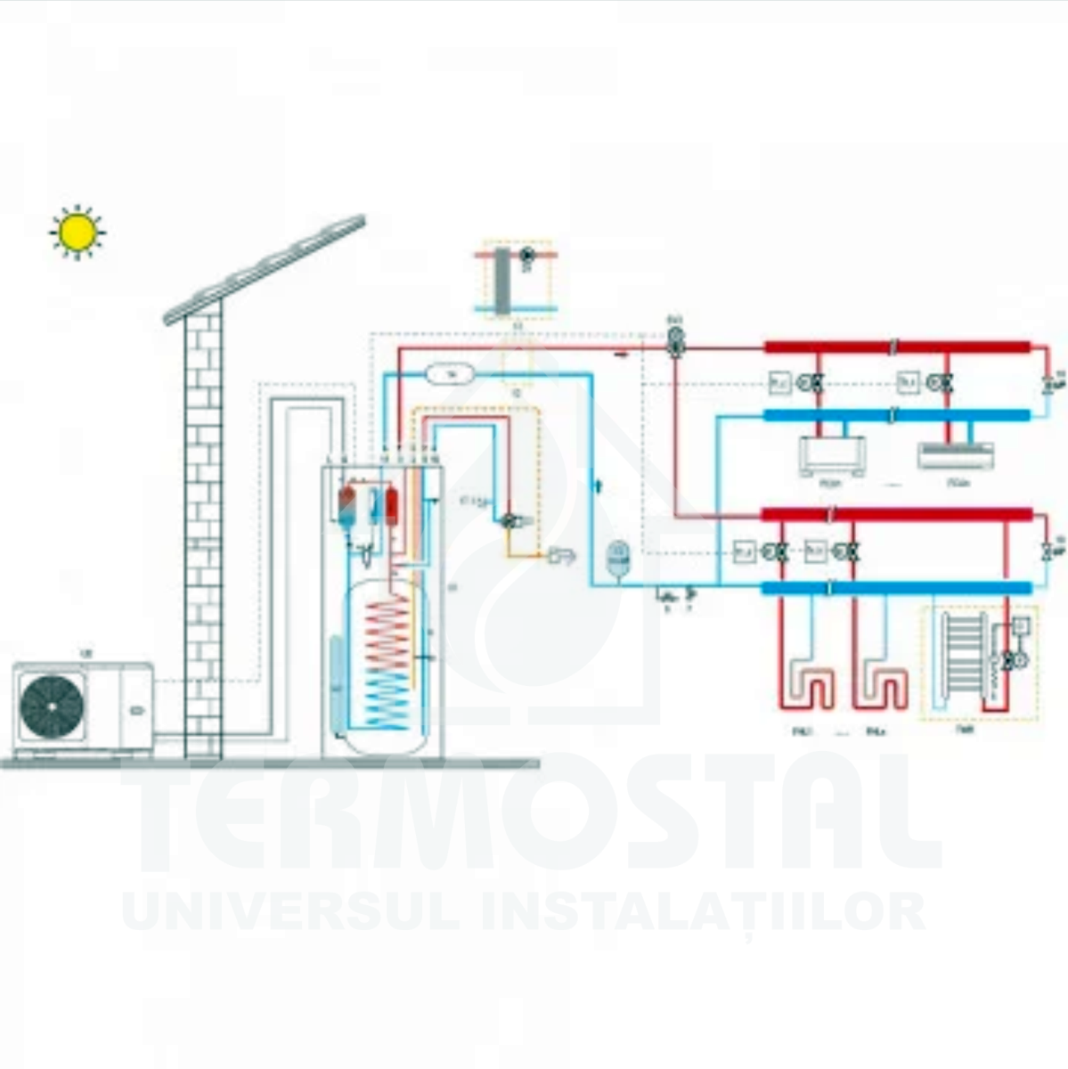 POMPE DE CĂLDURĂ REVERSIBILE SISTEM SPLIT CU COMPRESOR DC INVERTER ȘI BOILER ACM ÎNCORPORAT > CARACTERISTICI GENERALE Sunt compuse dintr-o Unitate exterioară care conține cele mai importante elemente ale circuitului frigorific, de la compresor la schimbătorul de căldură, care va fi racordată cu conductele de agent frigorific la Unitatea interioară. Unitatea interioară, pe de altă parte, conține restul circuitului frigorific precum și componentele principale ale circuitului hidraulic, precum pompa de căldură de înaltă eficiență sau vasul de expansiune, pentru a permite instalarea rapidă și sigură a echipamentelor. Este furnizat standard cu un sistem electric integrat de 3 kW pentru modelele monofazate și 6 kW pentru cele trifazate. OMNIA ST 3.2 diferă de OMNIA S 3.2 prin faptul ca are încorporat în unitatea internă un boiler cu o serpentină pentru producție de apă caldă menajeră. Pentru modelele de la 4 la 10 capacitatea boilerului este de 190 litri, iar pentru cele de la 12 la 16T capacitatea boilerului este de 240 litri. Acestui boiler i se poate cupla o rezistență electrică suplimentară cât și un kit pentru aport solar (ambele accesorii se montează în interiorul unității). Instalarea unui sistem split oferă avantajul incontestabil de a evita problema înghețului, chiar și la cele mai scăzute temperaturi (până la -25°C) sau în absența energiei electrice (singura problemă des întalnită în cazul pompelor de căldură monobloc). Toate unitățile satisfac exigențele sistemelor de încălzire/răcire, având capacitatea de a produce agent termic până la 65°C, fiind astfel ideale pentru toate tipurile de sisteme, fie că este vorba de încălzire în pardoseală, ventiloconvectoare, radiatoare sau producție de apă caldă menajeră (ACM) prin intermediul boilerului încorporat. Noul design Full Inverter Ferroli utilizează tehnologia DC inverter pe cele 3 principale consumatoare de energie ale echipamentului, adică compresorul, ventilatorul și pompa. Aceasta permite modularea distribuției puterii prin urmărirea atentă a încărcării termice, permițând astfel o eficiență energetică foarte mare și importante economii pentru utilizatorul final. Mai mult, designul Full Inverter Ferroli reduce consumul de energie electrică la pornire, evitând fluctuațiile rețelei electrice și mărind durata de viață a componentelor. Nivelul de zgomot este printre cele mai scăzute de pe piață, putând fi folosite fie autonom, fie integrate cu alte surse de căldură, de exemplu o centrală. Toate unitățile sunt furnizate cu o sondă de temperatură pentru un boiler ACM (nemontată) și o sondă de temperatură a aerului exterior (premontată pe unitatea exterioară) pentru o reglare optimă a temperaturii agentului termic conform curbei climatice alese atât pe încălzire cât și pe răcire. > PANOUL DE COMANDĂ - Interfața cu utilizatorul a fost echipată cu tehnologia Capsense, cu un afișaj grafic de 2,8", care permite interacțiunea utilizatorului cu produsul într-un mod extrem de simplu. Panoul de comandă al unității interioare realizează comunicarea simplă cu noile sisteme smart Connect CRP, care pot gestiona până la 8 termostate (7 Connect CRP Zone + 1 Connect CRP cu toate funcțiile programabile ale termostatului) împărțite în 2 zone, una directă și una mixtă. Principalele funcții de control includ: PROTOCOL MODBUS pentru control inteligent prin intermediul unui BMS extern. ÎNCĂLZIRE ȘI RĂCIRE în pompă de căldură ca sursă individuală. Modularea completă înseamnă menținerea optimă a temperaturii agentului termic, atât pe mod încălzire cât și pe mod răcire optimizând consumul pentru utilizator. Setarea curbei de temperatură (standard) poate îmbunătăți confortul și reduce și mai mult consumul. PRODUCȚIA DE APĂ CALDĂ MENAJERĂ (ACM) Când sonda de temperatură înregistrează o scădere a temperaturii sub o anumită valoare, echipamentul intră pe modul ACM. Vana cu 3 căi este furnizată standard. SURSE SUPLIMENTARE DE ÎNCĂLZIRE (centrală pe gaz/electrică). Pompa de căldură va putea activa aceste surse suplimentare, pe baza parametrilor personalizabili. Pe lângă aceste setări, activarea sursei suplimentare poate avea loc în caz de urgență, când pompa de căldură este defectă. INTRARE SMART GRID DE LA SISTEMUL FOTOVOLTAIC ȘI REȚEA - Unitatea este dotată cu 2 contacte digitale pentru a gestiona o intrare dintr-un sistem fotovoltaic și una de la rețea. Acestea optimizează consumul de energie. Primul contact (EVU) transmite pompei de căldură când sistemul fotovoltaic este încărcat: pompa de căldură își crește valoarea de setpoint ACM cu scopul de a-și îmbunătăți autoconsumul (avantaj utilizator). Contactul spre rețea (SG) avertizează când a crescut costul energiei electrice (dacă este permis de operator), care va fi apoi limitată în conformitate cu setările personalizate. Pentru mai multe detalii trebuie consultat manualul echipamentului. CONTROL DE LA DISTANȚĂ PRIN APLICAȚIE Disponibil pentru iOS și Android (cu control CRP opțional) REZISTENȚA ELECTRICĂ BOILER ACM În modul ACM se poate gestiona o rezistența electrică introdusă în boiler în vederea funcționării acesteia ca sursă suplimentară de energie, ca sursă totală de energie în caz de defectare a pompei de căldură sau pentru asigurarea funcției anti-legionella. FAST ACM Aceasta funcție proritizează producția de ACM activând toate sursele de încălzire disponibile pentru atingerea rapidă a temperaturii setate. FUNCȚIE ANTI-LEGIONELLA Permite setarea ciclurilor săptămânale anti-legionella. Pentru ca acesta să funcționeze corect, este necesară existența rezistenței în boilerul de ACM. MOD SILENȚIOS Când este activat, reduce frecvența maximă a compresorului și viteza ventilatorului astfel încât reduce semnificativ nivelul de zgomot. Disponi