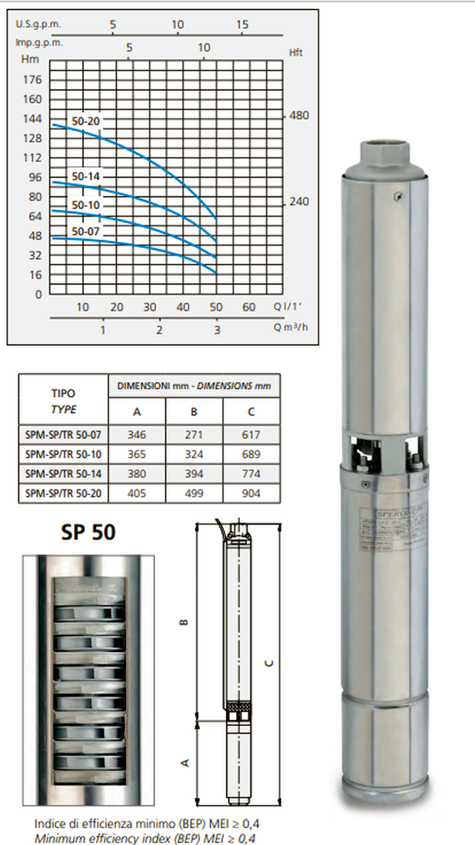 Pompa submersibila multietajata pentru put Speroni SPM 50-10, 0.55 kW, debit 3 m³/h Debit minim: 15 litri/min Debit maxim: 50 litri/min Debit maxim: 3 m³/h Inaltime maxima de refulare: 65 mCA Putere: 0,55 kW Putere: 0,75 HP Numar maxim porniri pe ora: 20 Continut de nisip: 60 g/m³ Temperatura maxima a lichidului: 35 °C Tip motor: 2 poli Grad de protectie: IP 68 Clasa de izolatie: F Tensiune de alimentare: 230 V Caracteristici constructive Racord refulare: 1 1/4" Diametru pompa: 4" Inaltime: 666 mm Material corp pompa: Otel Inox Pompa submersibila multietajata pentru put Speroni SPM 50-10, 0.55 kW, debit 3 m³/h Sunt destinate pomparii apelor curate din puturi de mare adancime cu diametru de minim 4″. In general sunt destinate alimentarii cu apa potabila. Sunt utilizate in scopuri civile si industriale pentru : - sisteme de irigatii - sisteme impotriva incendiilor - sisteme de instalatii echipate cu sprinklere Conditii de lucru: · Temperatura fluid: pana la 35°C · Continut de nisip maxim: 60 g/m³ · Numar maxim de porniri: 20/ora Motor: · Inductie cu 2 poli · Submersibil in baie de ulei · Clasa de izolatie: F · Protectie: IP 68 · Functionare continua Materiale motor: · Carcasa externa: otel inox · Ax motor: otel inox · Placa inferioara: tecno-polimer · Racord filetat: alama Materiale pompa: · Carcasa externa: otel inox · Ax motor: otel inox · Trepte si rotoare: policarbonat.