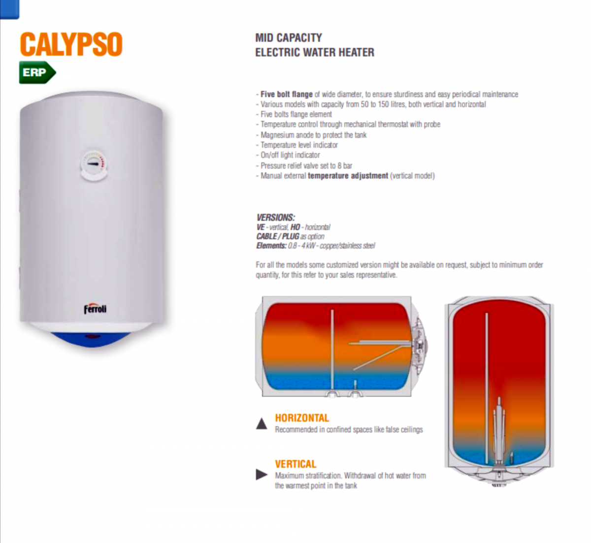 BOILER ELECTRIC CALYPSO 80 LT ORIZONTAL