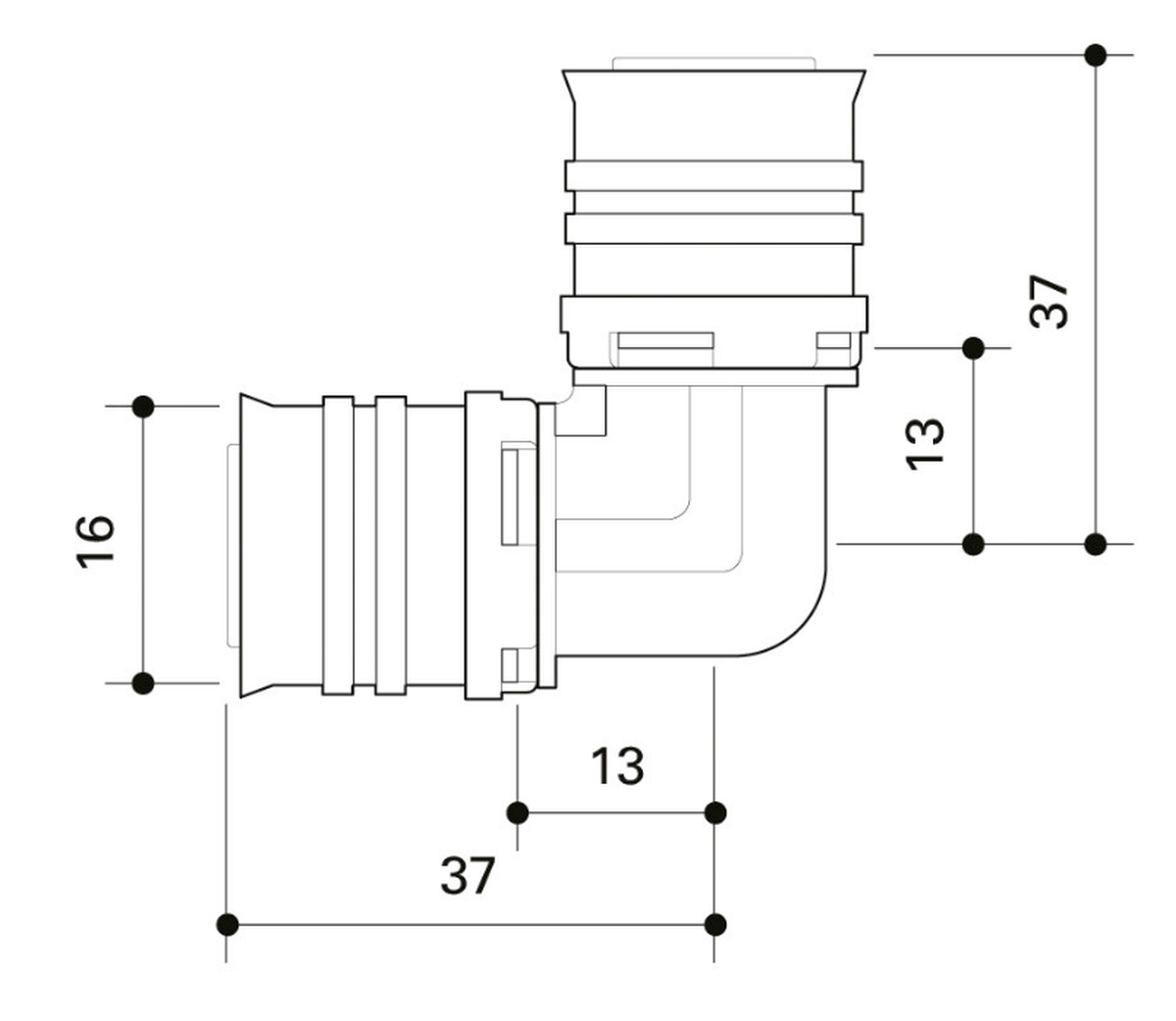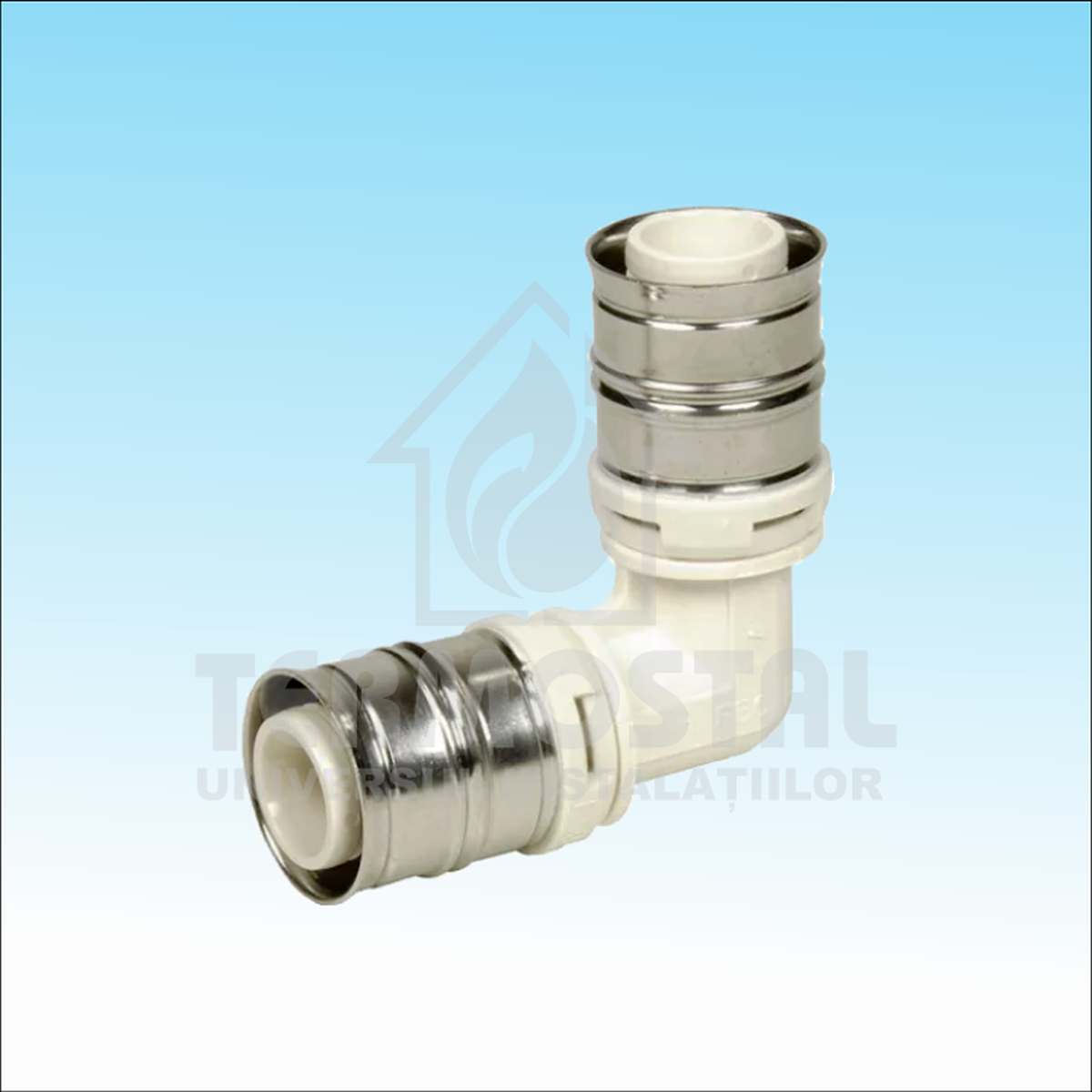 Unghi 90 grade realizat din PPSU pentru instalarea sistemelor de apă potabilă și încălzire cu inele de fixare albe cu ferestre de vizualizare integrate, manșoane fixe de presare din oțel inoxidabil și funcție de scurgere. Poate fi presat cu contururile presei F, TH, U, H, VP.