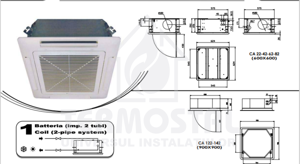 Model: CA Tara de origine: Italia Alimentare electrica: 230V/50HzVentiloconvectoarele de tip caseta, seria CA au un design elegant si sunt usor de instalat. Aceste ventiloconvectoare tip caseta (cu 2 tevi) sunt complet echipate inclusiv pompa de condens si telecomanda. Refularea pe 4 directii asigura o distributie uniforma a aerului in incapere. Aceste ventiloconvectoarele de plafon sunt silentioase si sunt usor de armonizat cu orice fel de interior.
