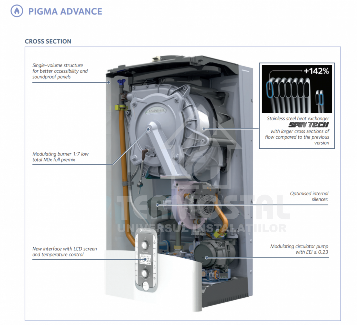 Modelul Chaffoteaux (Shafuto) PIGMA ADVANCE 25 este un cazan fiabil și de înaltă tehnologie de condensare de ultimă generație, realizat din materiale de calitate și durabile și echipat cu o gamă largă de echipamente avansate. Cazanul cu două circuite va crea o încălzire fiabilă și va stabili o aprovizionare stabilă cu apă fierbinte. Cazanele de condensare cu gaz de la compania Chaffoteaux seria PIGMA ADVANCE sunt caracterizate prin eficiență energetică ridicată și au cele mai recente echipamente funcționale, care asigură fiabilitatea și siguranța tuturor modelelor, precum și ușurința utilizării acestora. Cazanele sunt fabricate în carcase moderne compacte și sunt proiectate pentru plasarea pe perete. Beneficii Noul schimbător de căldură primar din oțel inoxidabil. Secțiunile de trecere au crescut cu 142% față de versiunea anterioară. Eficiența energetică sezonieră 94%. Coeficientul de modulare 1: 10. Controlul electronic al sistemului de ardere. Funcția SRA. Trecerea la gaz lichefiat. Conexiuni electrice intuitive. Economisiți până la 25% energie în combinație cu funcția Expert Control și funcția SRA. Emisii reduse de poluanți, clasa NOx 6.