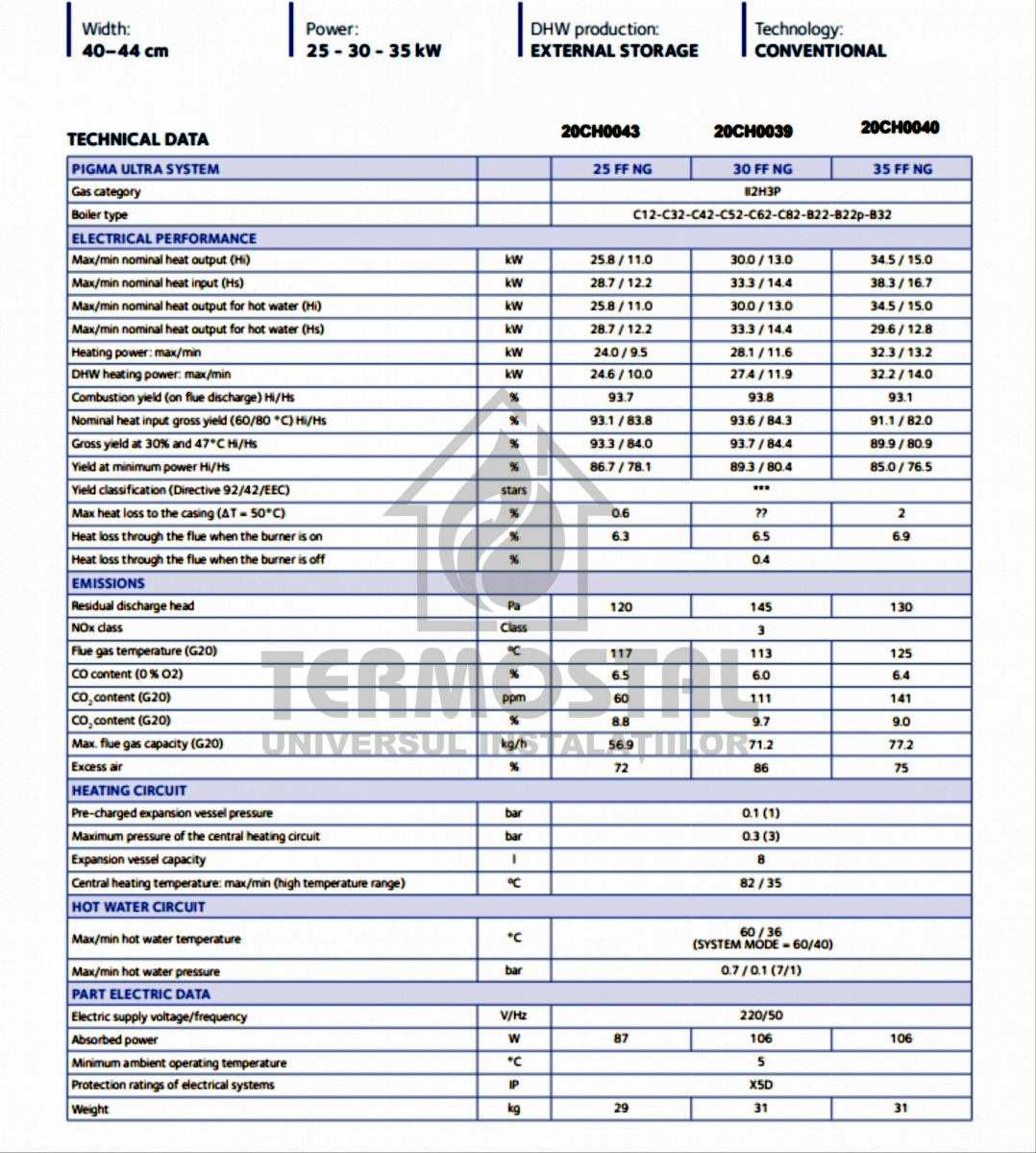 Cazanele de încălzire cu gaz din seria Chaffoteaux Pigma ULTRA SYSTEM sunt excelente pentru sistemele fabricate la comandă. Aceste cazane se caracterizează printr-o încălzire excepțională și se disting prin costuri reduse de energie și un nivel ridicat de confort. Un grad ridicat de siguranță este asigurat de o serie de moduri de protecție, mecanisme de siguranță și setări suplimentare. Puterea termică nominală, în funcție de model, variază de la 15 la 35 kW. Afișajul cu cristale lichide și panoul de control contribuie la simplitatea și ușurința în gestionarea sistemului. Printre altele, cazanele sunt echipate cu un rezervor extins și o pompă de circulație