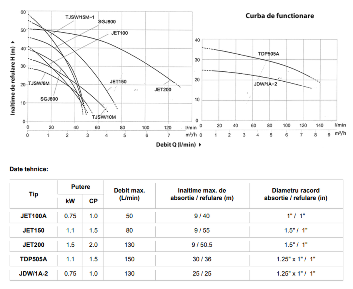Pompele de suprafata au fost proiectate să pompeze apă curată, fără substanţe periculoase şi fără gaze dizolvate. Aplicaţii tipice: alimentarea cu apă potabilă, irigaţii, mărirea presiunii în diverse instalaţii, distribuţia apei. Modelele TDP505A, JDW/1A-2 sunt pompe de suprafata de mare adâncime, cu dublu circuit, fiind recomandate pentru situațiile în care sursa de apa se afla la o adâncime mai mare de 9 m faţă de locul unde este amplasata pompa de suprafata. Toate pompele de apă sunt adecvate pentru uz casnic, cu condiţia ca temperatura apei să nu depăşească 35°C. Temperatura maximă in locul de funcţionare: 40°C. Numărul maxim de porniri per oră: 40.