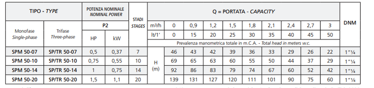 Pompa submersibila multietajata pentru put Speroni SPM 50-10, 0.55 kW, debit 3 m³/h Debit minim: 15 litri/min Debit maxim: 50 litri/min Debit maxim: 3 m³/h Inaltime maxima de refulare: 65 mCA Putere: 0,55 kW Putere: 0,75 HP Numar maxim porniri pe ora: 20 Continut de nisip: 60 g/m³ Temperatura maxima a lichidului: 35 °C Tip motor: 2 poli Grad de protectie: IP 68 Clasa de izolatie: F Tensiune de alimentare: 230 V Caracteristici constructive Racord refulare: 1 1/4" Diametru pompa: 4" Inaltime: 666 mm Material corp pompa: Otel Inox Pompa submersibila multietajata pentru put Speroni SPM 50-10, 0.55 kW, debit 3 m³/h Sunt destinate pomparii apelor curate din puturi de mare adancime cu diametru de minim 4″. In general sunt destinate alimentarii cu apa potabila. Sunt utilizate in scopuri civile si industriale pentru : - sisteme de irigatii - sisteme impotriva incendiilor - sisteme de instalatii echipate cu sprinklere Conditii de lucru: · Temperatura fluid: pana la 35°C · Continut de nisip maxim: 60 g/m³ · Numar maxim de porniri: 20/ora Motor: · Inductie cu 2 poli · Submersibil in baie de ulei · Clasa de izolatie: F · Protectie: IP 68 · Functionare continua Materiale motor: · Carcasa externa: otel inox · Ax motor: otel inox · Placa inferioara: tecno-polimer · Racord filetat: alama Materiale pompa: · Carcasa externa: otel inox · Ax motor: otel inox · Trepte si rotoare: policarbonat.